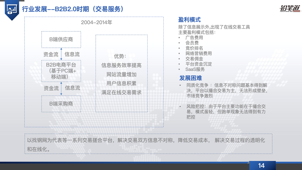 1999年阿里巴巴的出現(xiàn)標志著中國B2B電子商務(wù)的開端,至今已20年,我國B2B電商從1.0時代走進3.0時代,基于平臺逐步打造生態(tài)系統(tǒng)閉環(huán),業(yè)務(wù)模式向產(chǎn)業(yè)鏈上下游縱向延伸,利用ABC(AI人工智能+BigData大數(shù)據(jù)+Cloud Computing云計算)賦能產(chǎn)業(yè)鏈,也賦予了平臺更大的價值,B2B電商將在未來產(chǎn)生更大的想象力。