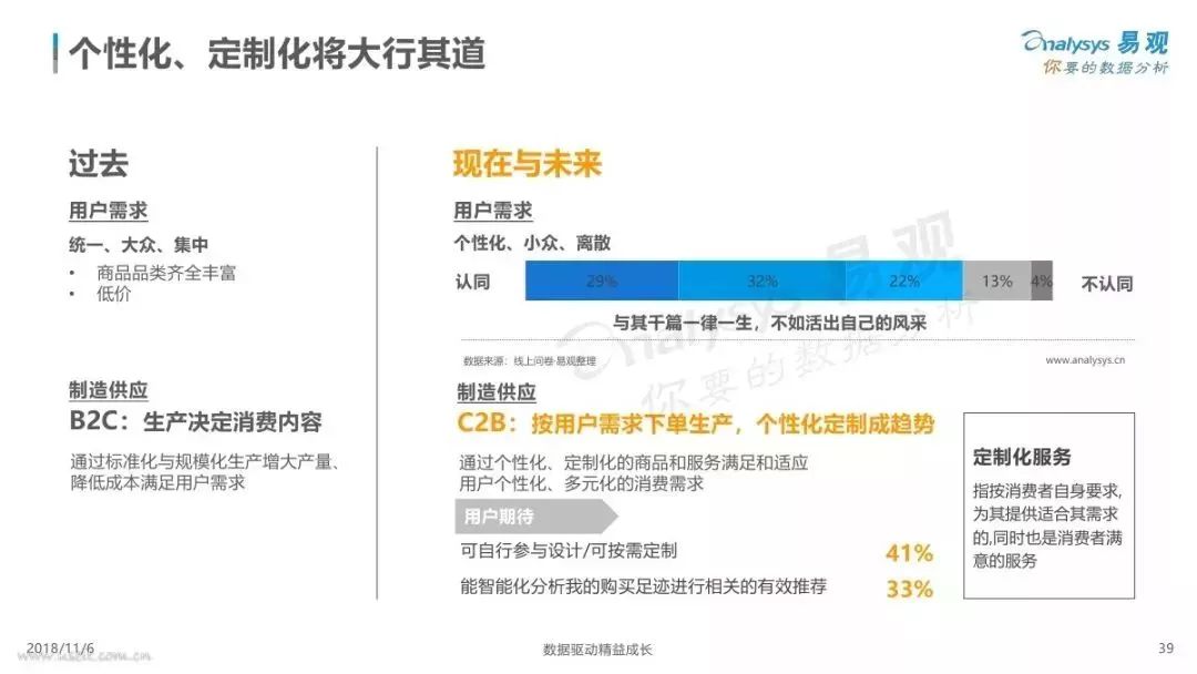 如今中國(guó)的消費(fèi)市場(chǎng)呈現(xiàn)分級(jí)化趨勢(shì),根據(jù)易觀發(fā)布的《新消費(fèi)趨勢(shì)洞察白皮書2018》白皮書顯示,人們對(duì)個(gè)性化、定制化的需求越來越多,33%的用戶期待智能化分析購(gòu)買足跡進(jìn)行相關(guān)的有效推薦。