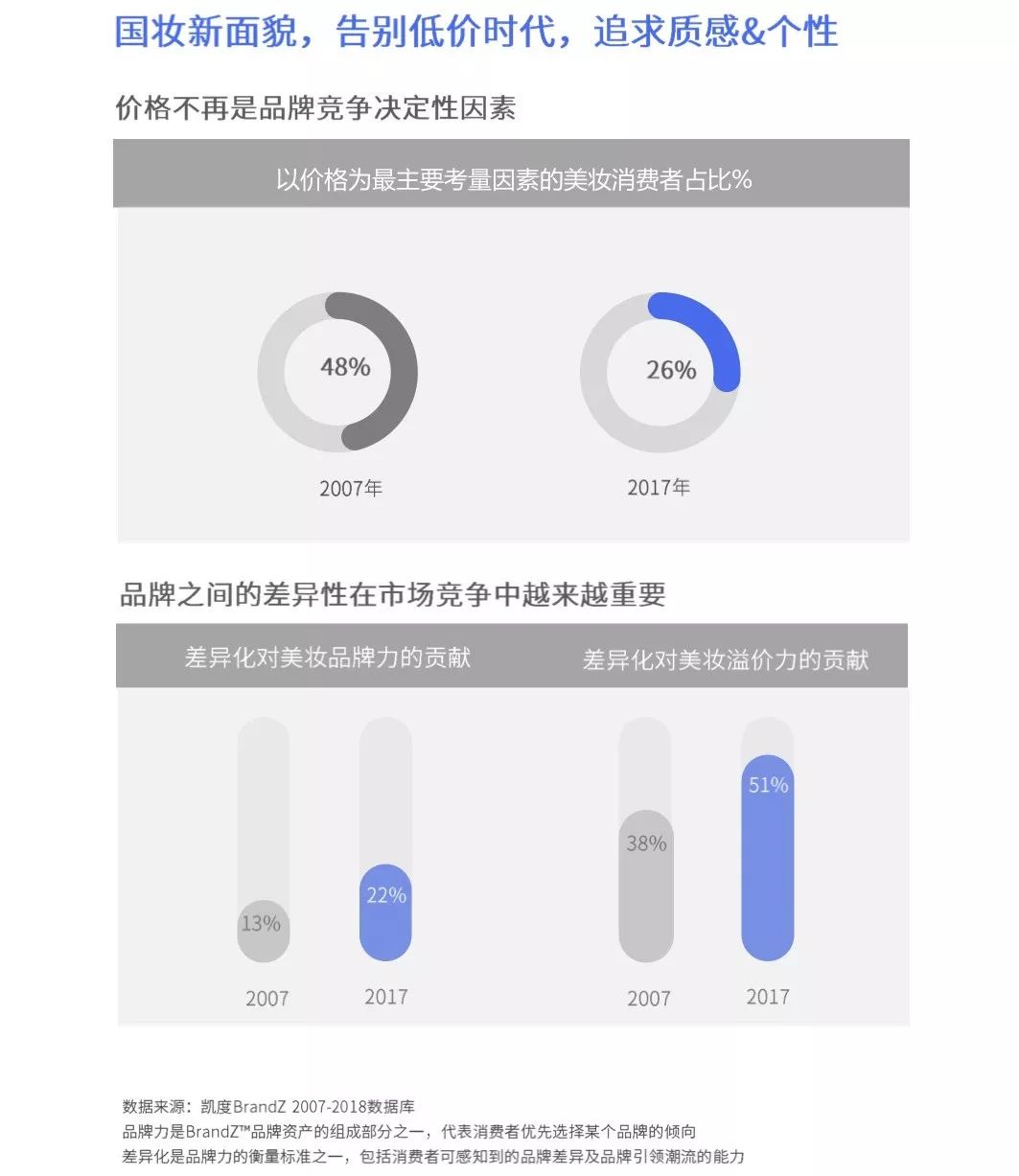 再?gòu)钠放平嵌葋砜?,《騰訊國(guó)貨美妝洞察報(bào)告》顯示品牌之間的差異性將越來越重要,到17年差異化對(duì)美妝溢價(jià)力的貢獻(xiàn)已達(dá)到51%。