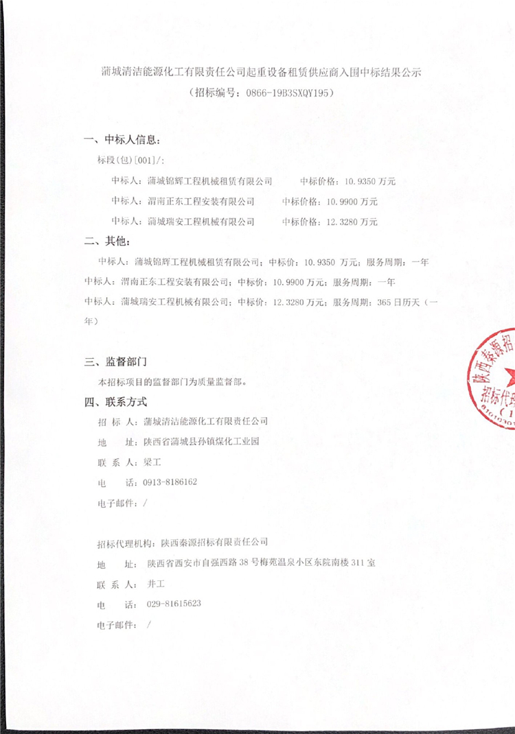 蒲城清潔能源化工有限責(zé)任公司起重設(shè)備租賃供應(yīng)商入圍中標(biāo)結(jié)果公示