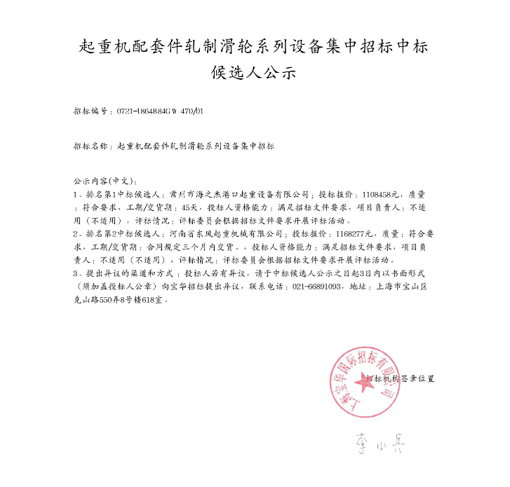移動版:起重機配套件軋制滑輪系列設備集中招標中標候選人公示