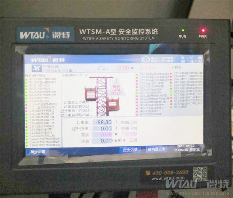 走進(jìn)該廠區(qū),遠(yuǎn)遠(yuǎn)望去就能看見這臺(tái)高空中的大家伙,靜靜的坐在那里,偶爾左右來回移動(dòng)一下。為了它,我們前后三次爬上了50多米的高空跟他近距離的接觸,最后一次下來的時(shí)候雙腿都在發(fā)抖,心想要是有個(gè)電梯就好了(后得知是有電梯的,壞了)。經(jīng)過微特的仔細(xì)調(diào)研以及跟客戶的溝通過程中發(fā)現(xiàn),微特的WTSM-A型起重機(jī)監(jiān)控系統(tǒng)非常適用于該設(shè)備的。近地觀測,遠(yuǎn)程監(jiān)控,將該設(shè)備的每一個(gè)動(dòng)作進(jìn)行實(shí)時(shí)監(jiān)測,可有效的排除安全隱患。