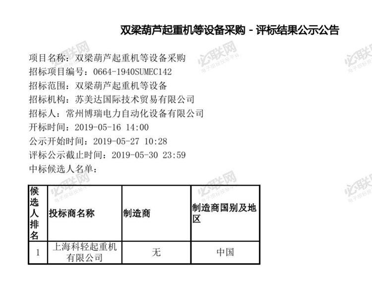 移動版:雙梁葫蘆起重機(jī)等設(shè)備采購中標(biāo)公告