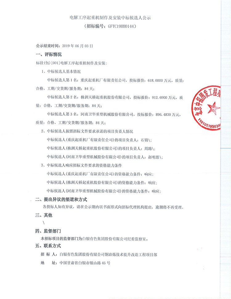 移動版:電解工序起重機(jī)制作及安裝中標(biāo)候選人公示