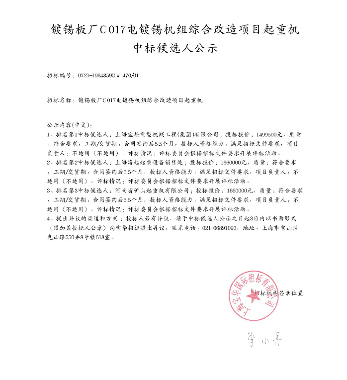 鍍錫板廠C017電鍍錫機(jī)組綜合改造項(xiàng)目起重機(jī)中標(biāo)候選人公示