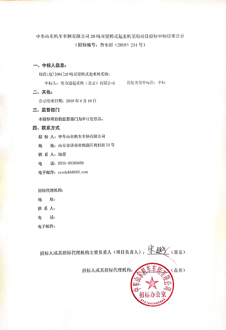 中車山東機車車輛有限公司20噸雙梁橋式起重機采購項目招標(biāo)中標(biāo)結(jié)果公示