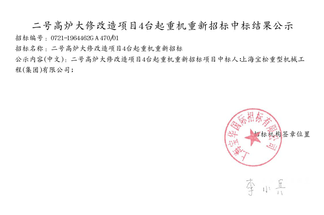 二號高爐大修改造項(xiàng)目4臺(tái)起重機(jī)重新招標(biāo)中標(biāo)結(jié)果公示