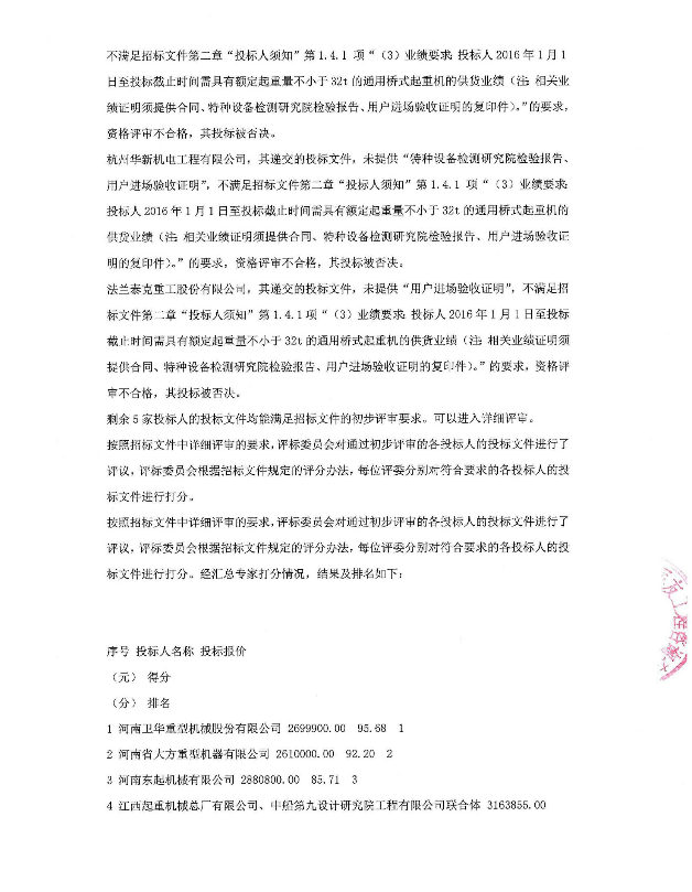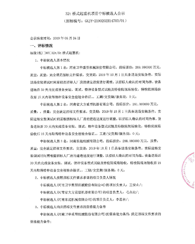 移動版:32t橋式起重機(jī)項目中標(biāo)候選人公示