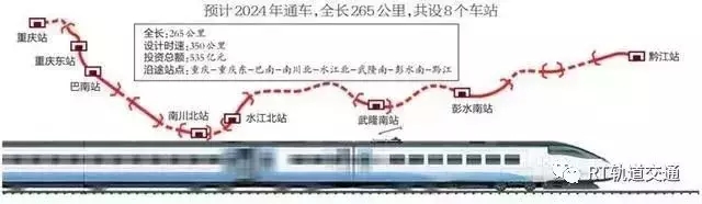 主要建設線路起自重慶站,經巴南、南川、武隆、彭水,終至黔江站,正線全長265公里,設站8座,其中新建6座。同步建設重慶東動車所動車出入段線、重慶樞紐東環(huán)聯絡線。項目投資估算總額為535億元,本項目由渝萬鐵路公司作為項目業(yè)主負責項目實施,項目建設工期5年半。