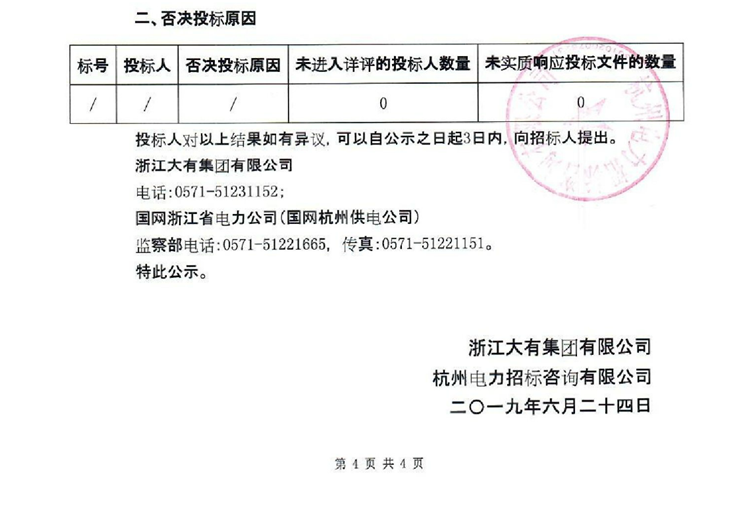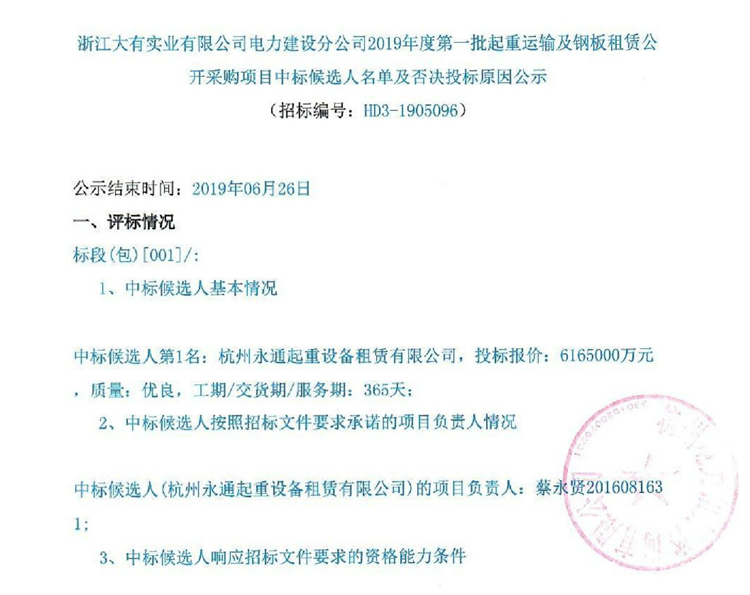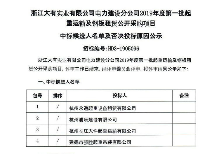 移動版:浙江大有實業(yè)有限公司電力建設分公司2019年度第一批起重運輸及鋼板租賃公開采購項目中標候選人名單及否決投標原因公示