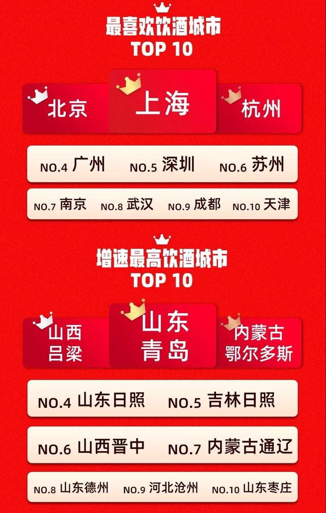 除此之外,山東青島、山西呂梁、內(nèi)蒙古鄂爾多斯成為增速最高的飲酒城市,而山東日照、吉林日照、山西晉中、內(nèi)蒙古通遼等二三線城市酒類消費(fèi)增速顯著增高。