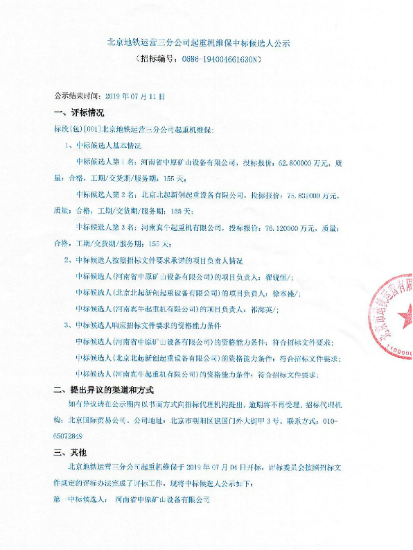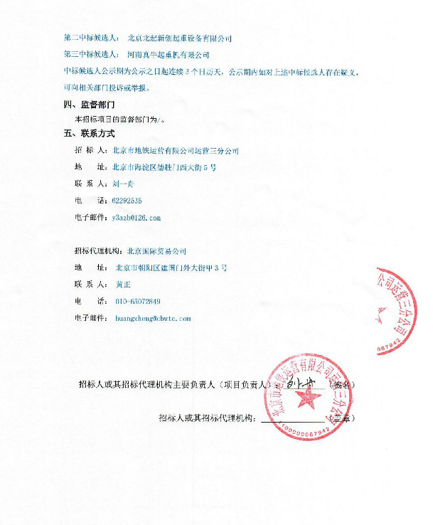北京地鐵運營三分公司起重機維保中標候選人公示