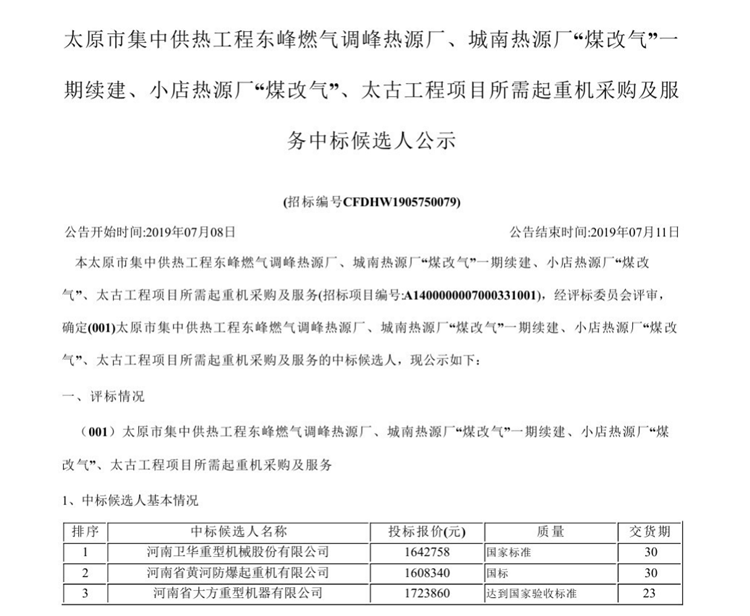 移動版:太原市集中供熱工程東峰燃?xì)庹{(diào)峰熱源廠、城南熱源廠“煤改氣”一期續(xù)建、小店熱源廠“煤改氣”、太古工程項(xiàng)目所需起重機(jī)采購及服務(wù)中標(biāo)候選人公示