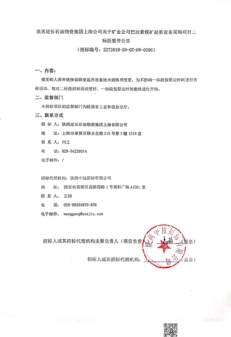 移動版:陜西延長石油物資集團上海公司關于礦業(yè)公司巴拉素煤礦起重設備采購項目二標段暫停公告