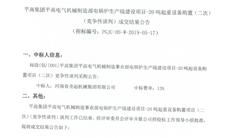 移動版:平高集團平高電氣機械制造部電鍋爐生產(chǎn)線建設(shè)項目-20噸起重設(shè)備購置(二次)(競爭性談判)成交結(jié)果公告