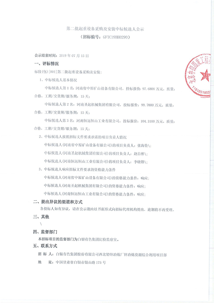 第二批起重設(shè)備采購及安裝中標(biāo)候選人公示