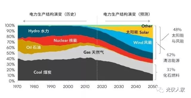 根據(jù)BNEF對(duì)綜合技術(shù)發(fā)展趨勢(shì)和能源成本的分析,到2050年,煤電在全球能源中的占比將從目前的37%下降至12%,而石油將基本消失。風(fēng)能和光能則會(huì)從目前的7%上升至2050年的48%,水力、天然氣、核能占比則在1%上下浮動(dòng)。