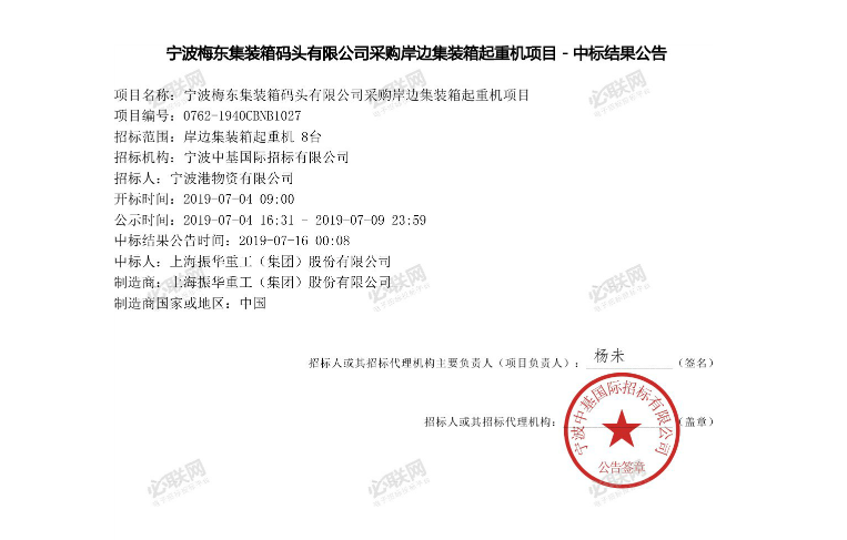 寧波梅東集裝箱碼頭有限公司采購(gòu)岸邊集裝箱起重機(jī)項(xiàng)目中標(biāo)結(jié)果公告(1)