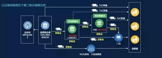 在低線市場呢?因?yàn)榕渌偷陌霃较鄬^長,單個(gè)訂單的要貨量太少,訂貨的頻次太低,很難形成公交化物流,所以說品牌商可能仍然需要用經(jīng)銷商或者二批商來去做,但是沒有關(guān)系,只需要把經(jīng)銷商的倉庫進(jìn)行規(guī)范管理,交易在線,一樣可以實(shí)現(xiàn) 2B2C 的物流一體化協(xié)同。