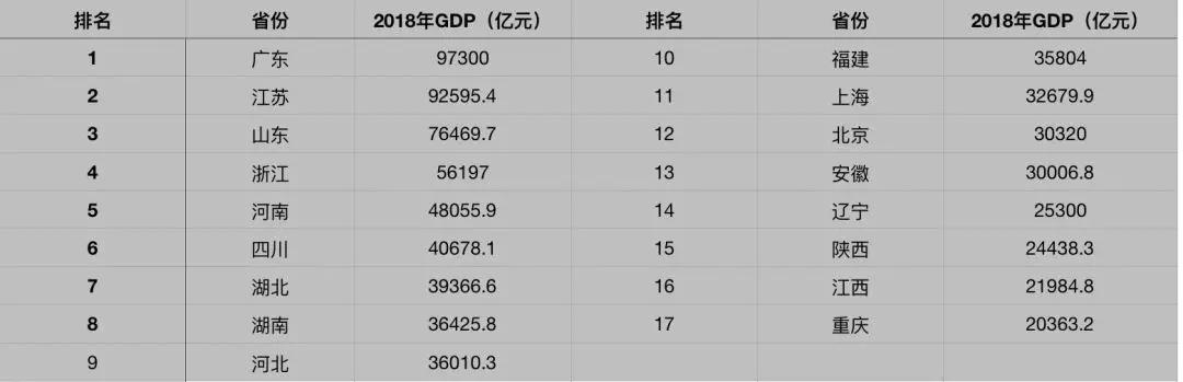 據(jù)數(shù)據(jù)顯示,2018年全國GDP十強(qiáng)省份分別為:廣東(9.73萬億)、江蘇(9.26萬億)、山東(7.65萬億)、浙江(5.62萬億)、河南(4.8萬億)、四川(4.07萬億)、湖北(3.94萬億)、湖南(3.64萬億)、河北(3.6萬億)、福建(3.58萬億)。而這些省市大多屬于中國的一二線城市群。