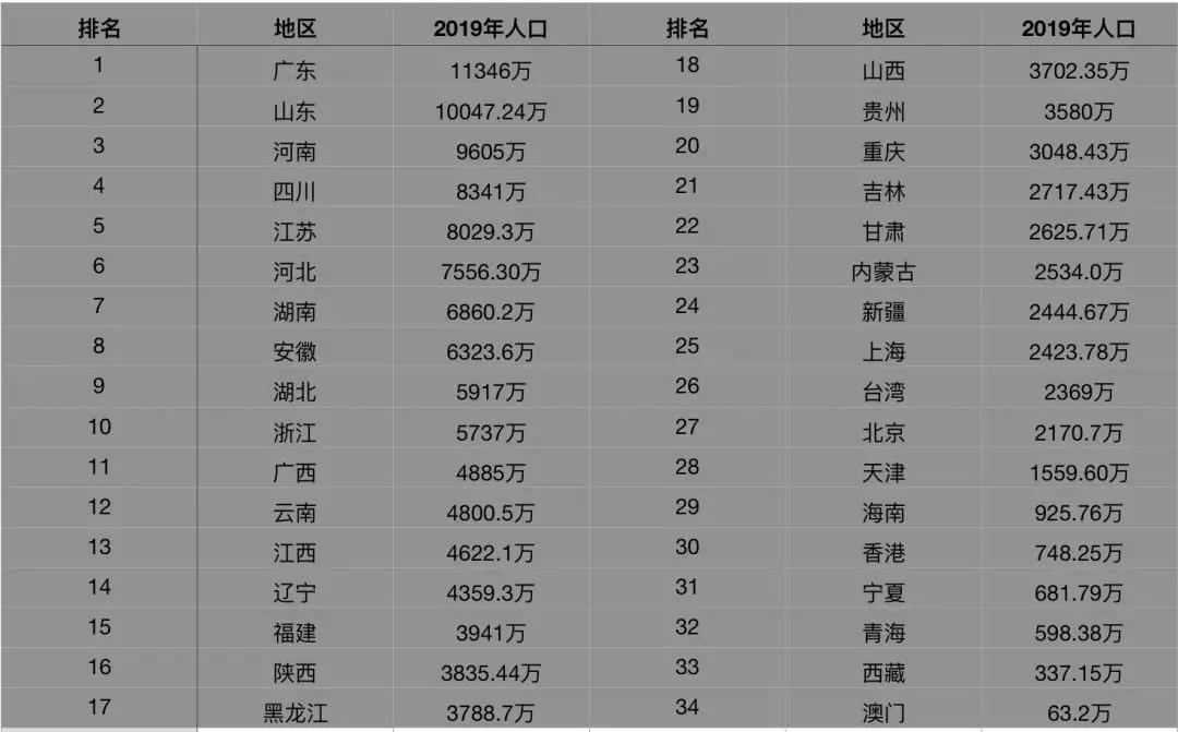 2019全國各省人口排名