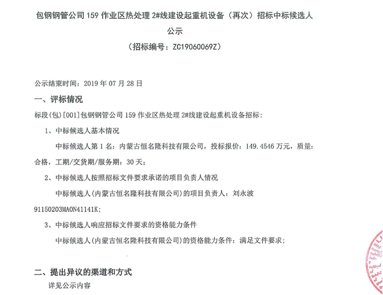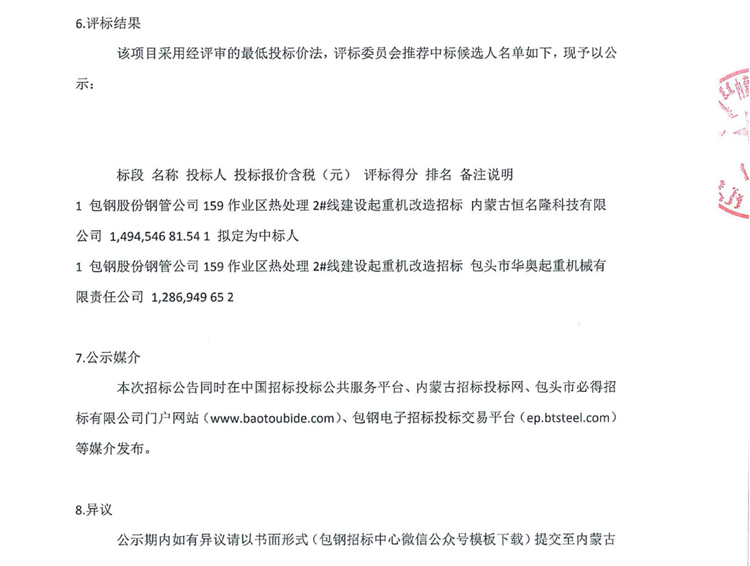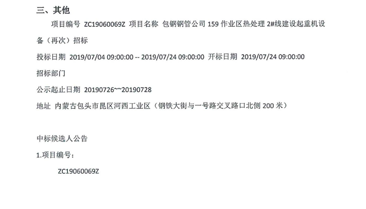 移動(dòng)版:包鋼鋼管公司159作業(yè)區(qū)熱處理2#線(xiàn)建設(shè)起重機(jī)設(shè)備(再次)招標(biāo)中標(biāo)候選人公示