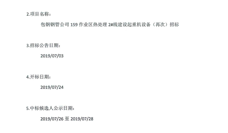包鋼鋼管公司159作業(yè)區(qū)熱處理2#線(xiàn)建設(shè)起重機(jī)設(shè)備(再次)招標(biāo)中標(biāo)候選人公示