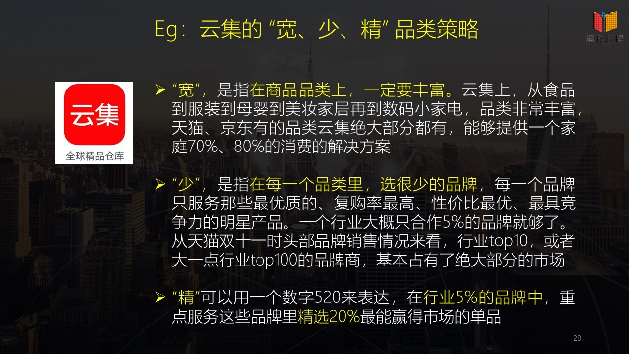 難點(diǎn)就是你如何找到每個商品的爆品,這是一個非常困難的事情。給大家提供一個云集的思路,云集的一個思路是他是寬、少、精,商品品類上面一定要豐富,否則你的人群還是會比較窄。這個就需要考驗(yàn)各位選品團(tuán)隊(duì)的能力。