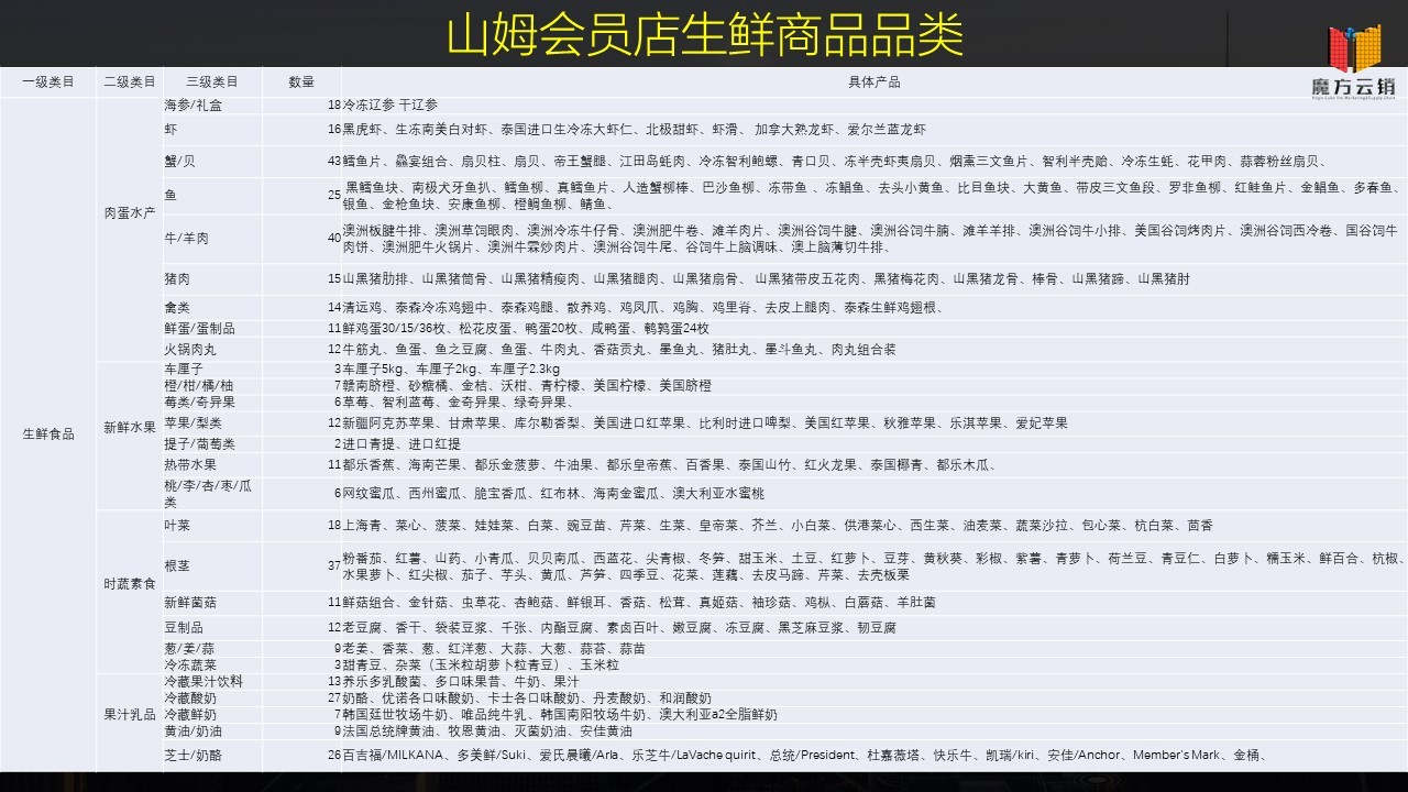大家看一下比例結(jié)構(gòu)。這是山姆會員店的生鮮商品的品類,在山姆會員店里面生鮮類占到60%,通過這個可以看出生鮮是最容易帶來流量的。