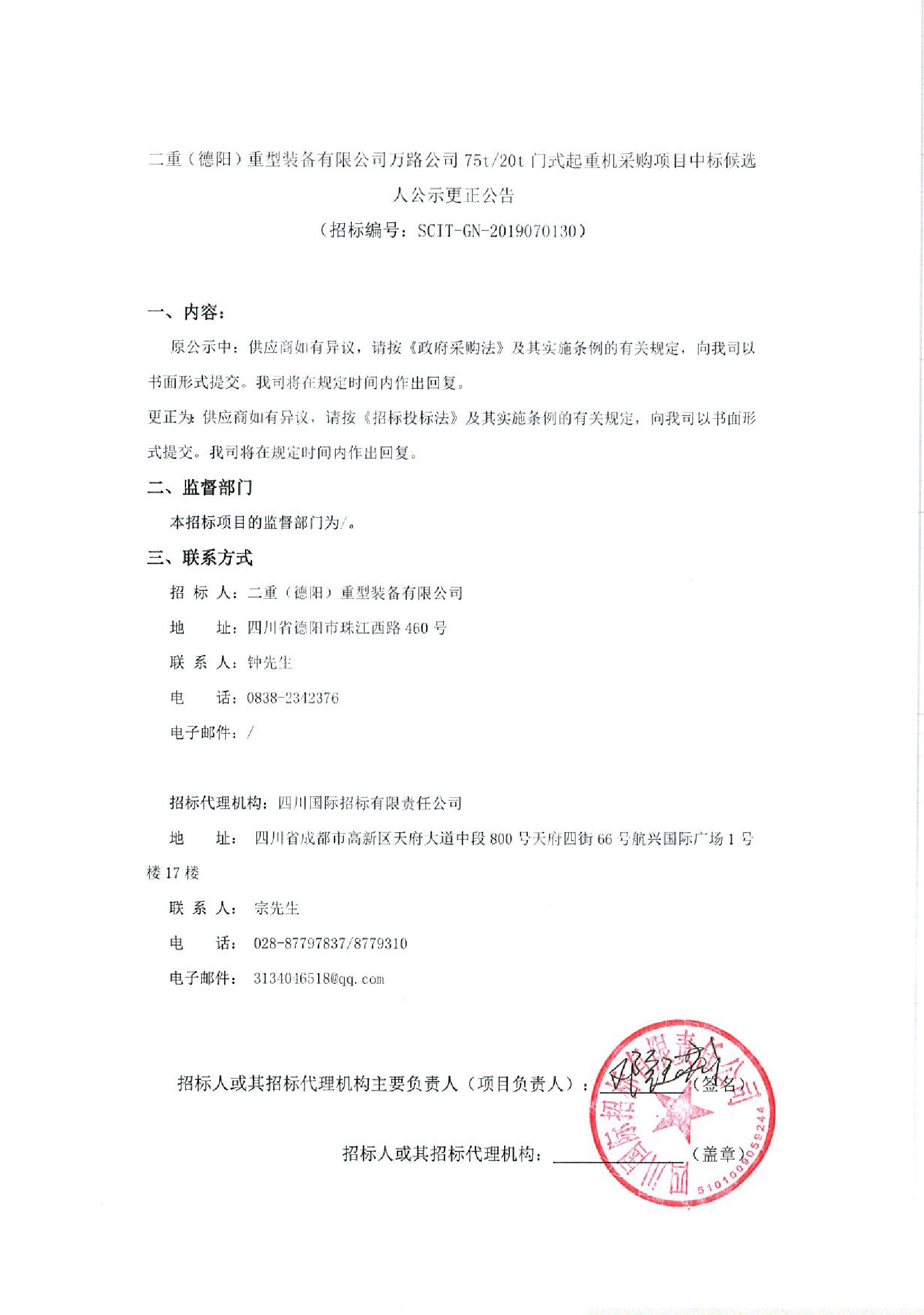 二重(德陽)重型裝備有限公司萬路公司75t/20t門式起重機(jī)采購項(xiàng)目中標(biāo)候選人公示更正公告