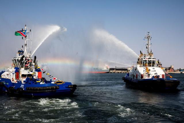 8月2日,在納米比亞沃爾維斯灣新集裝箱碼頭竣工儀式上,消防船用水柱搭建起“水門”慶祝。