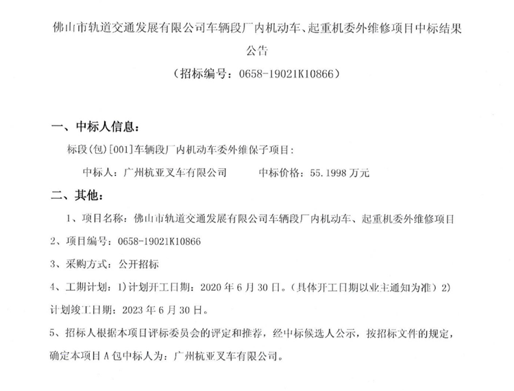 佛山市軌道交通發(fā)展有限公司車輛段廠內(nèi)機動車、起重機委外維修項目中標結(jié)果公告