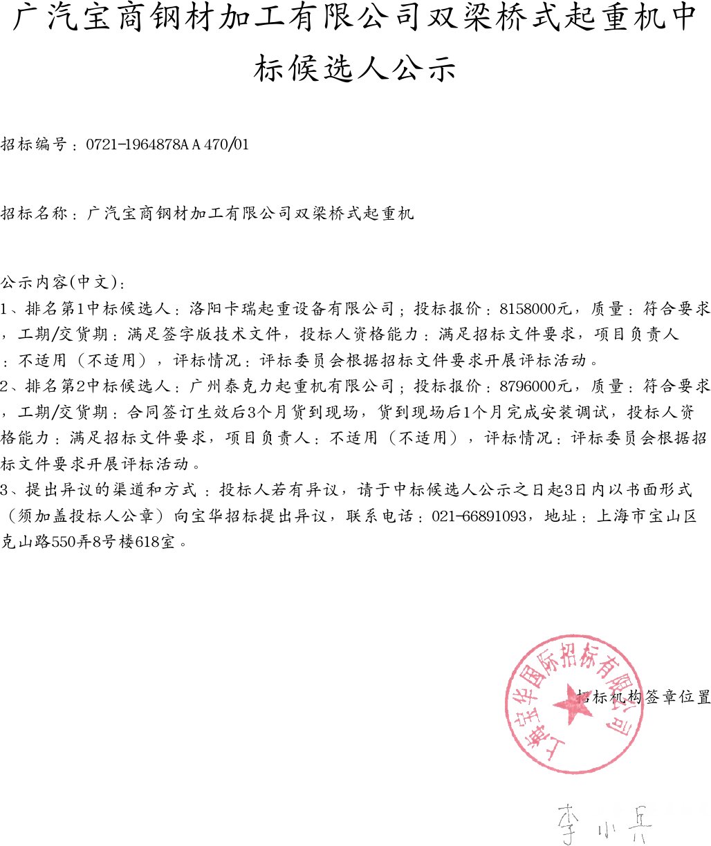 移動版:廣汽寶商鋼材加工有限公司雙梁橋式起重機(jī)中標(biāo)候選人公示