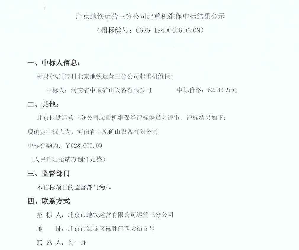 北京地鐵運(yùn)營三分公司起重機(jī)維保中標(biāo)結(jié)果公示