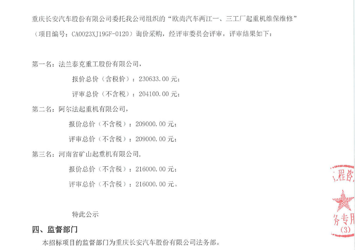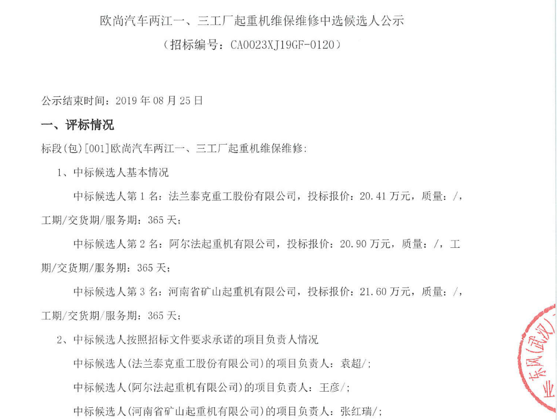 移動版:歐尚汽車兩江一、三工廠起重機(jī)維保維修中選候選人公示
