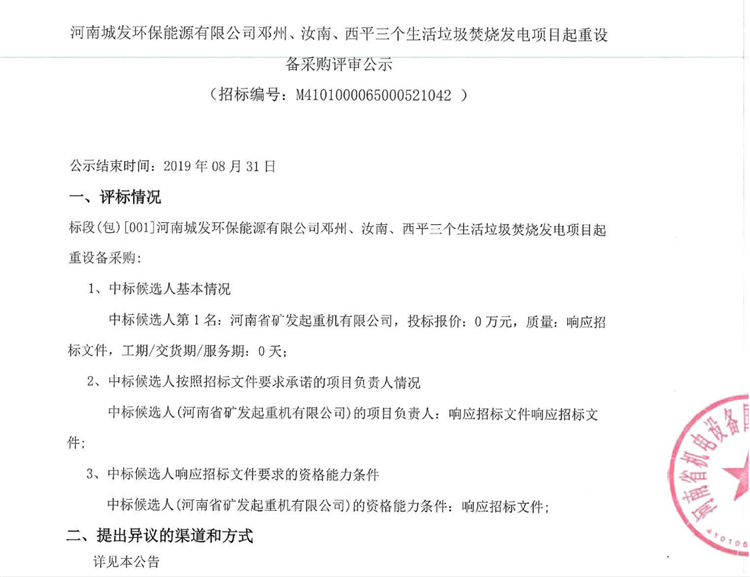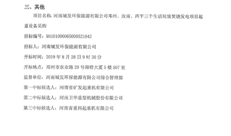 移動版:河南城發(fā)環(huán)保能源有限公司鄧州、汝南、西平三個生活垃圾焚燒發(fā)電項(xiàng)目起重設(shè)備采購評審公示
