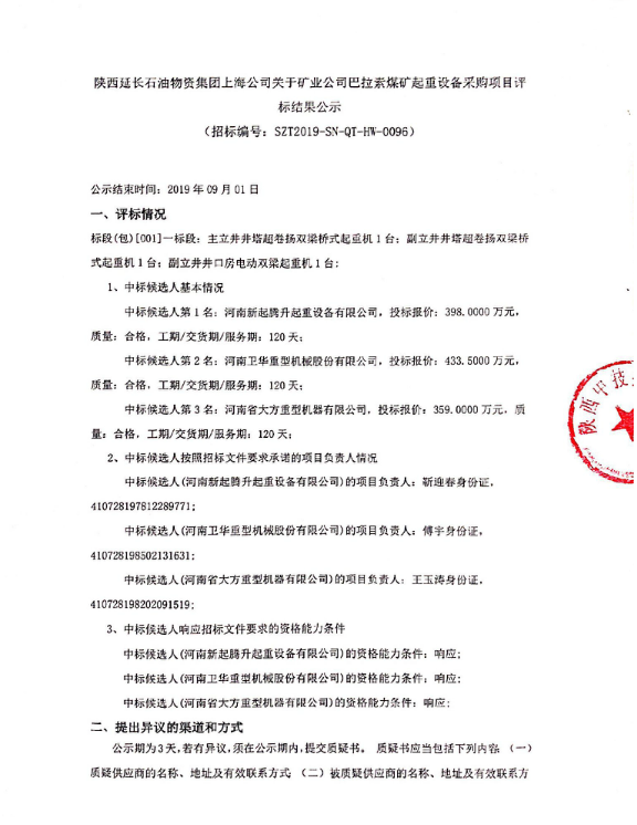 陜西延長石油物資集團(tuán)上海公司關(guān)于礦業(yè)公司巴拉素煤礦起重設(shè)備采購項(xiàng)目評標(biāo)結(jié)果公示