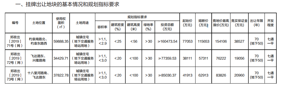 8月30日,經(jīng)鄭州市人民政府批準(zhǔn),鄭州市自然資源和規(guī)劃局決定以網(wǎng)上掛牌方式出讓鄭政出〔2019〕71、72、73號(網(wǎng))地塊的國有建設(shè)用地使用權(quán),三宗地塊起拍價共15.71億元,合計(jì)198.21畝地。