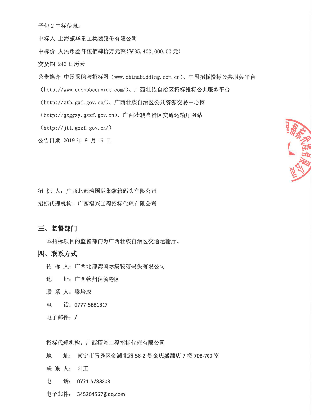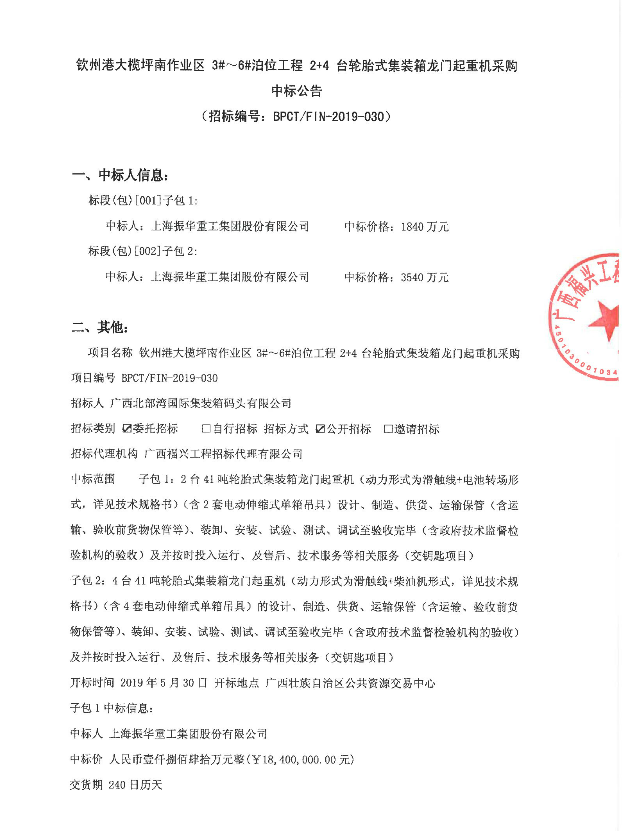 移動(dòng)版:欽州港大欖坪南作業(yè)區(qū) 3#~6#泊位工程 2+4 臺(tái)輪胎式集裝箱龍門(mén)起重機(jī)采購(gòu)中標(biāo)公告