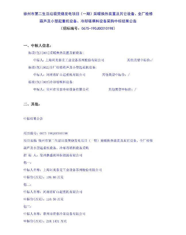 徐州市第二生活垃圾焚燒發(fā)電項目(一期)采暖換熱裝置及其它設備、全廠檢修葫蘆及小型起重機設備、冷卻塔填料設備采購中標結(jié)果公告