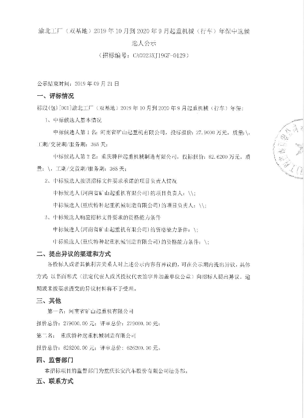 渝北工廠(雙基地)2019年10月到2020年9月起重機(jī)械(行車)年保中選候選人公示