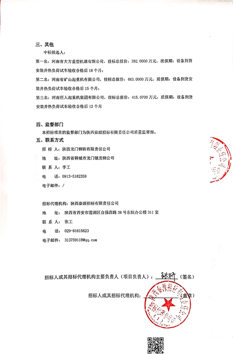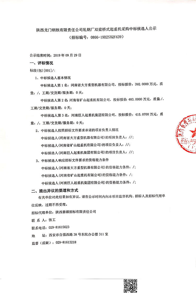 陜西龍門鋼鐵有限責(zé)任公司軋鋼廠雙梁橋式起重機(jī)采購(gòu)中標(biāo)候選人公示