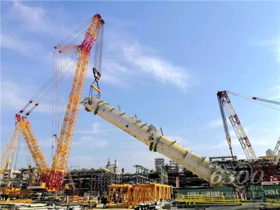 此次被吊裝的設(shè)備為該項(xiàng)目最核心、最重的洗滌塔。該塔高101.1米,直徑8.6米,重達(dá)1926噸。徐工XGC88000作為主吊車,采用主臂102米+副臂27米的作業(yè)工況,1250噸吊車配合進(jìn)行溜尾吊裝。
