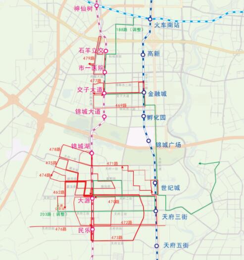 ②交子大道站:新開469路(地鐵交子大道站—地鐵交子大道站)、477路(地鐵交子大道站—地鐵金融城站),調(diào)整188路(火車南站綜合交通樞紐—公濟(jì)橋路西)銜接地鐵1號(hào)線金融城站。