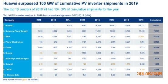 近日,多家機(jī)構(gòu)相繼發(fā)布2019年逆變器出貨量排名報告。其中,Wood Mackenzie發(fā)布的Global solar PV and MLPE inverter market 2020報告顯示,2019年全球光伏逆變器出貨量前2位均是中國企業(yè),其中排名第一的華為2019年出貨量約28.121GW,累計(jì)出貨量109.557GW,穩(wěn)居全球首位;IHS Markit報告也指出,2019年全球逆變器出貨TOP10企業(yè)中,有5家是中國企業(yè),華為更是連續(xù)5年蟬聯(lián)冠軍,王者地位不可撼動。