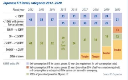 自2020年4月也就是日本最新財政年度的第一個月開始,新的上網(wǎng)電價政策開始生效:其中關(guān)鍵的變化是新政策的費率和對規(guī)模從10 kW到50 kW的光伏系統(tǒng)的自我消耗要求,以及參加投標的項目容量下限從之前的500 kW降低到了250 kW。