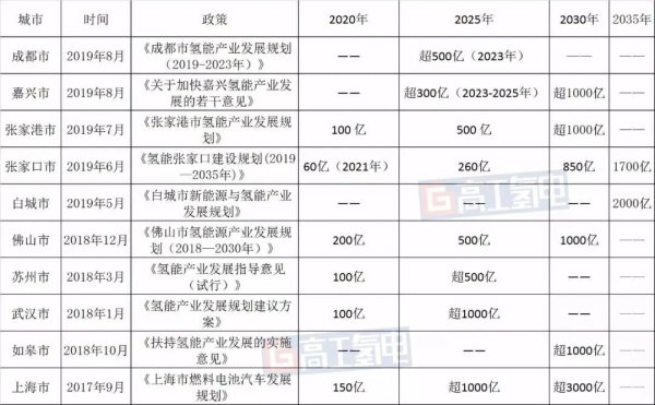 據(jù)高工氫電統(tǒng)計(jì),截止到去年下半年,全國(guó)已經(jīng)有佛山、深圳、茂名、成都、北京、株洲等30個(gè)多城市發(fā)布相關(guān)的氫能規(guī)劃路線圖。除白城市之外,還有成都市、上海市、如皋市、嘉興市、蘇州市、武漢市、張家口市、佛山市、張家港市等城市在規(guī)劃中明確了到2020年、2025年、2030、2035年氫能產(chǎn)業(yè)年產(chǎn)值目標(biāo),詳見(jiàn)下表:
