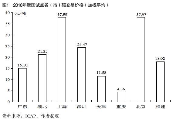 2011年10月,國家發(fā)展改革委確定在北京、天津、上海、重慶、廣東(廣州)、湖北、深圳開展碳排放權(quán)交易試點(diǎn),2013年6月,深圳率先啟動碳交易;2016 年9月,福建省為貫徹落實《國家生態(tài)文明試驗區(qū)(福建)實施方案》,加入碳交易試點(diǎn)。目前,8 個試點(diǎn)地區(qū)覆蓋了電力、鋼鐵、水泥、建筑、交通運(yùn)輸、石油化工等行業(yè)超過3200家重點(diǎn)排放企業(yè),整體履約良好,低碳意識不斷提高,實現(xiàn)了碳排放總量和強(qiáng)度“ 雙下降” 。2 0 1 8 年我國試點(diǎn)省市碳排放權(quán)交易平均價格為21.3元/噸;截至2018年底,我國碳市場累計成交量接近8億噸,累計成交額超過110億元(我國試點(diǎn)省市碳交易價格見圖1,試點(diǎn)碳市場運(yùn)行情況見表1)。
