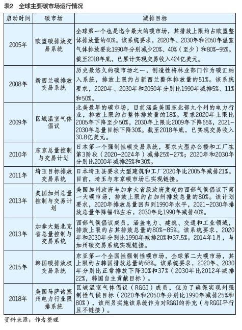 當(dāng)前,全球正面臨持續(xù)嚴(yán)峻的氣候問題挑戰(zhàn),各國2030年自主貢獻(xiàn)目標(biāo)與實現(xiàn)巴黎氣候協(xié)定目標(biāo)仍存在巨大缺口。為碳排放權(quán)定價、構(gòu)建碳交易市場,已成為國際社會促進(jìn)低碳發(fā)展和技術(shù)創(chuàng)新的關(guān)鍵政策工具。除目前已運(yùn)行的碳市場外,還有許多國家或地區(qū)正在籌建或考慮建立碳交易系統(tǒng)(包含中國、俄羅斯、日本、墨西哥、巴西等國家系統(tǒng)以及美國各州等區(qū)域系統(tǒng))。隨著越來越多的國家或地區(qū)考慮將碳市場作為節(jié)能減排的政策工具, 碳交易已逐漸成為全球應(yīng)對氣候變化政策的核心支柱(全球目前主要碳市場運(yùn)行情況見表2)。