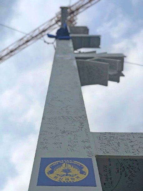 圖為上海迪士尼度假區(qū)、上海國際旅游度假區(qū)管委會、上海申迪(集團)有限公司、華特迪士尼幻想工程員工在首根鋼結構柱上簽名留念。新華網(wǎng) 發(fā)